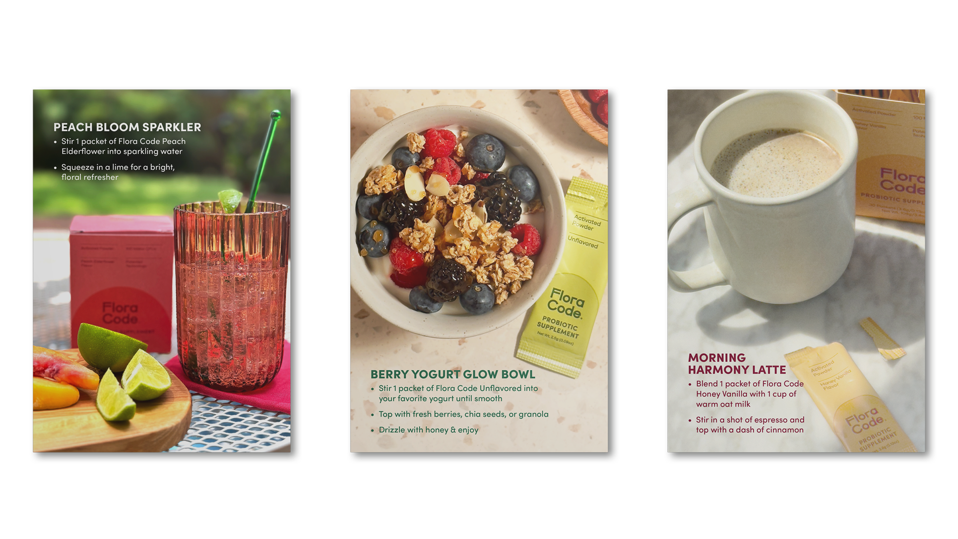 To highlight the versatility of Flora Code and their flavors, we created and photographed original recipes that seamlessly integrate the product into daily wellness routines, reinforcing its role in everyday health rituals.
