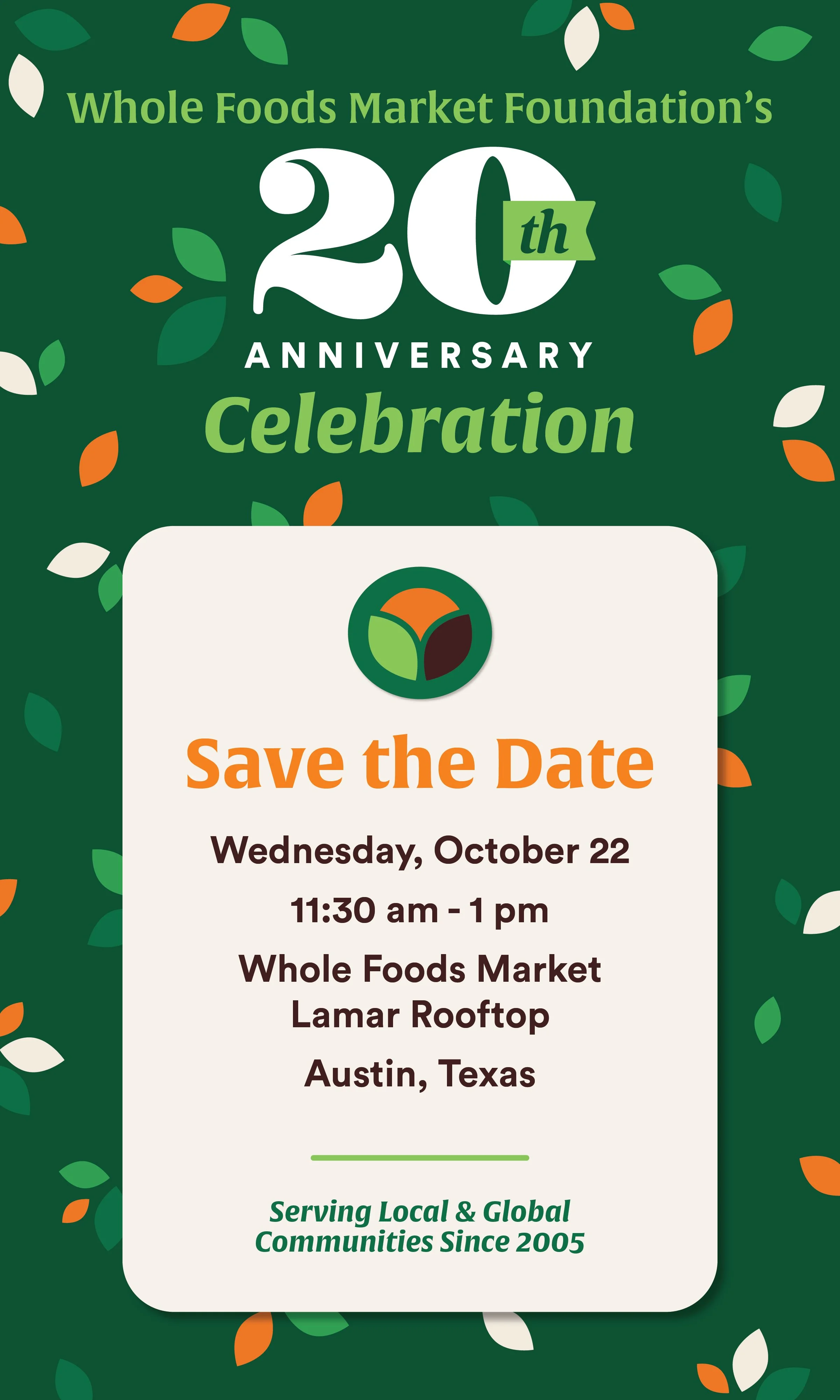The Whole Foods Market Foundation connected with us to help define a 20-year anniversary identity for their landmark achievement. Since 2005, their work has been a force for good, transforming communities by increasing access to healthy food, educating kids, and building financial stability in 81 countries. We took on the challenge of creating a celebratory and impactful mark that had to seamlessly coexist with their established brand. The resulting identity powerfully tells the story of two decades of cultivating prosperity for generations to come.